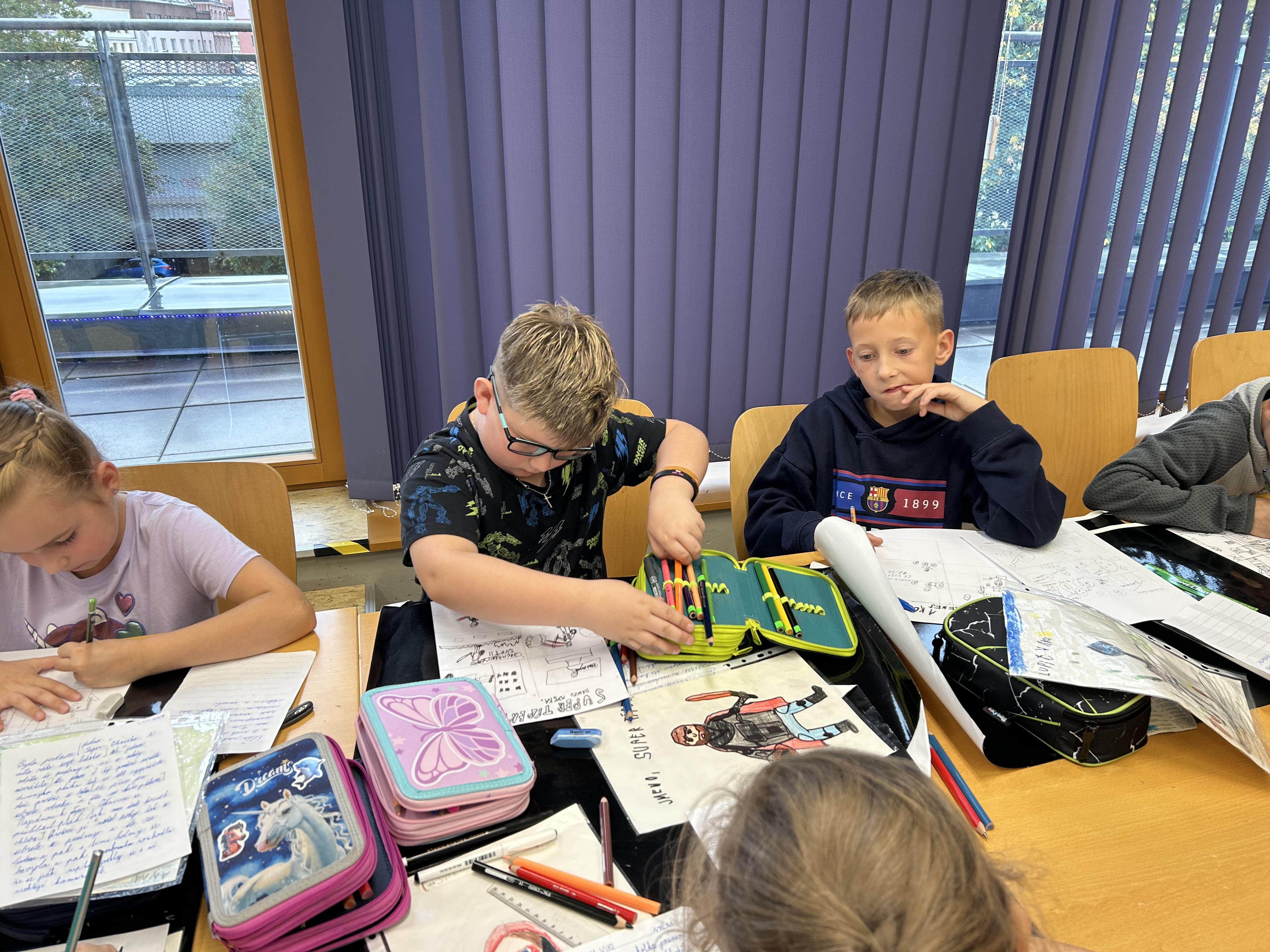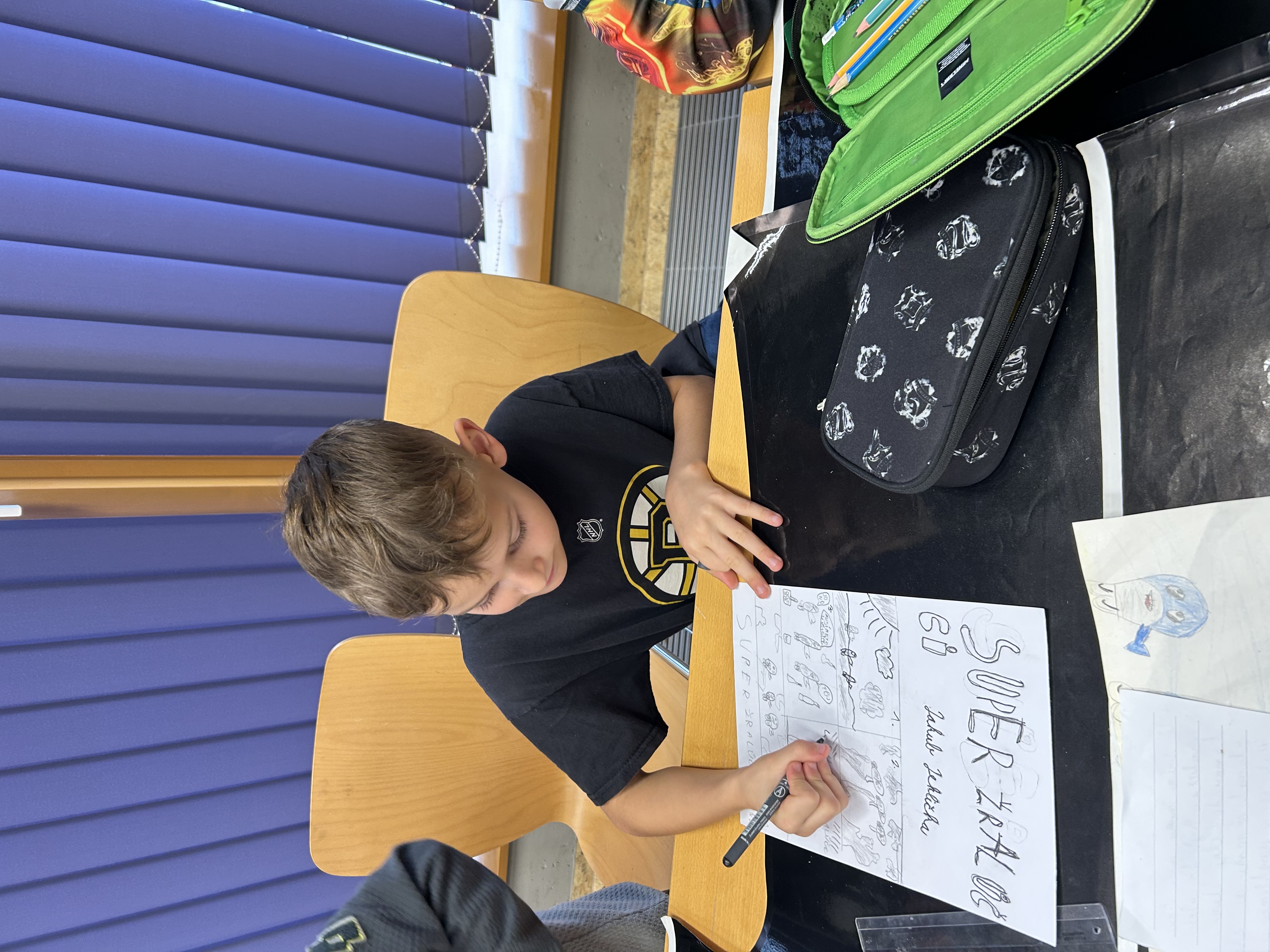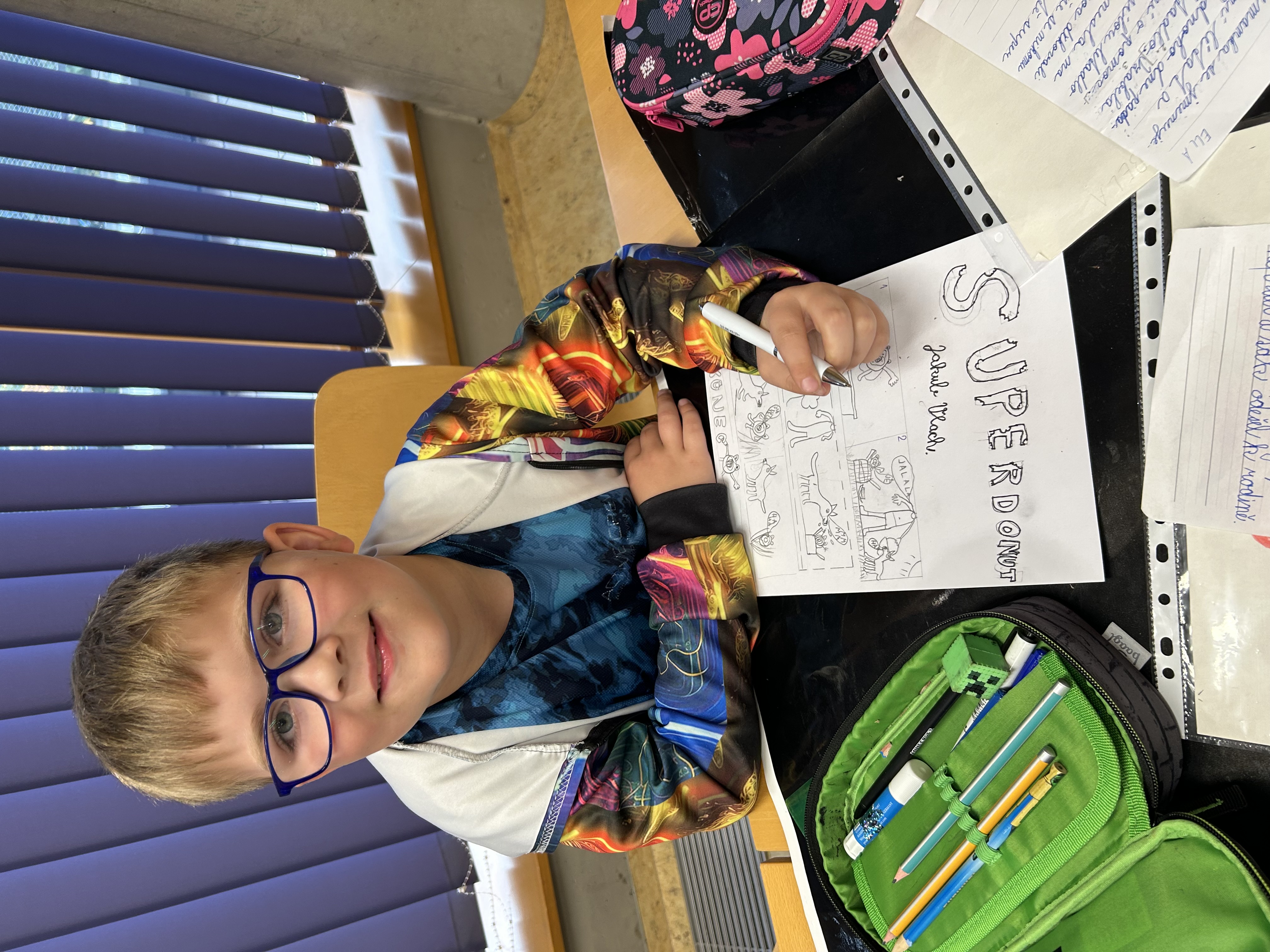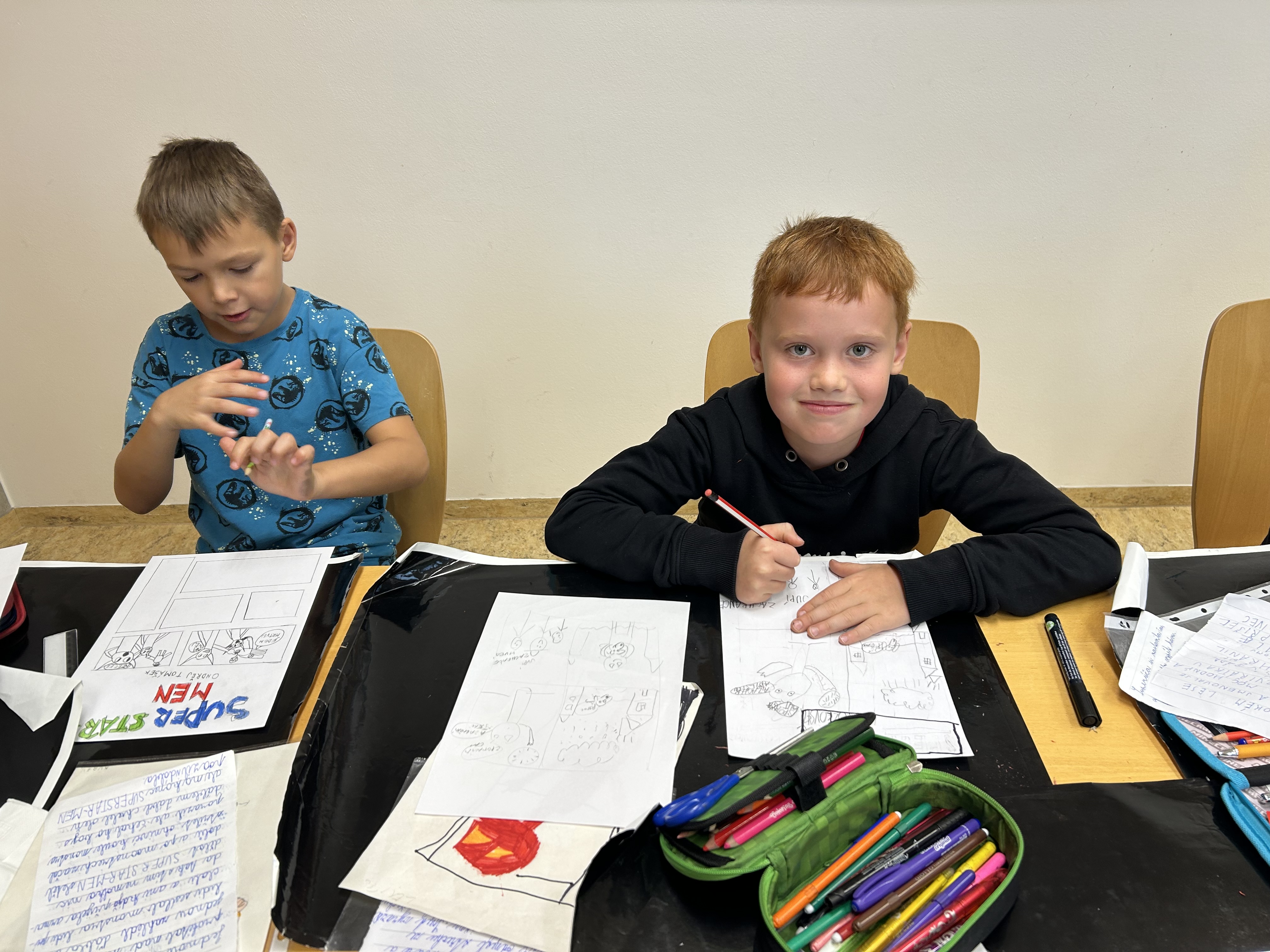 Děti si přinesly obrázek svého superhrdiny a krátký scénář k příběhu, který budou tvořit.